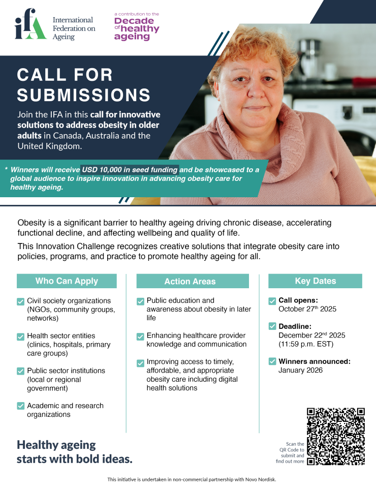 Accordingly, the International Federation on Ageing (IFA), in non-commercial partnership with Novo Nordisk, is hosting an Innovation Challenge to recognize and elevate creative and novel community-led initiatives in Canada, the United Kingdom, and Australia, that support greater access to, and improved integration of, obesity care within healthy ageing strategies and promotion of good health across the life course, with a focus on older adults and later life.