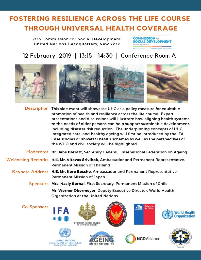 IFA is also sponsoring a side event during the Session on 12 February 2019 — on “Fostering Resilience Across the Life Course Through Universal Health Coverage.” The objective of this side event is to showcase UHC as a policy measure for equitable promotion of health and resilience across the life course. Expert presentations and discussions will illustrate how aligning health systems to the needs of older persons can help support sustainable development, including disaster risk reduction. Dr. Jane Barratt will be the moderator, while the speakers will be: